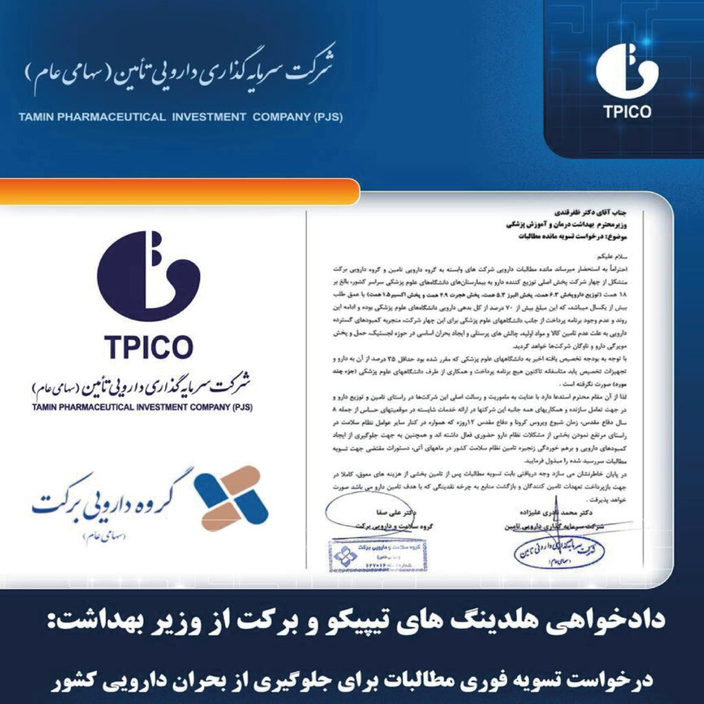 دو هلدینگ بزرگ دارویی کشور، تیپیکو و برکت، در نامهای رسمی به امضای مدیران عامل خود، از وزیر بهداشت خواستار تسویه فوری مانده مطالبات دارویی شدند. متن نامه به شرح زیر است؛